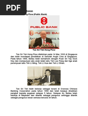 Public Bank Docx Company Description Contact Info Menara Public Bank 146 Jalan Ampang Kuala Lumpur 50450 Malaysia Phone 60 3 2176 6000 Fax 60 3 2163 Course Hero from www.coursehero.com Puan sri tay sock noy. He is married to puan sri tay sock noy since 1956 and they have four children. Teh hong piaw attended his formal primary and secondary education in singapore.dr. Teh's success today is attributed through his hard work and perseverance where he worked and move his way up. Next successful leader is tan sri dato' sri dr teh hong piow. Tan sri dato' seri dr. He is founder of public bank, tan sri teh is currently the chairman of the public bank group, apart from holding leadership in positions in various organizations in malaysia and singapore. Tan sri dato' seri dr.