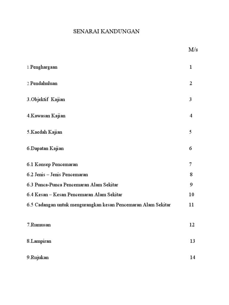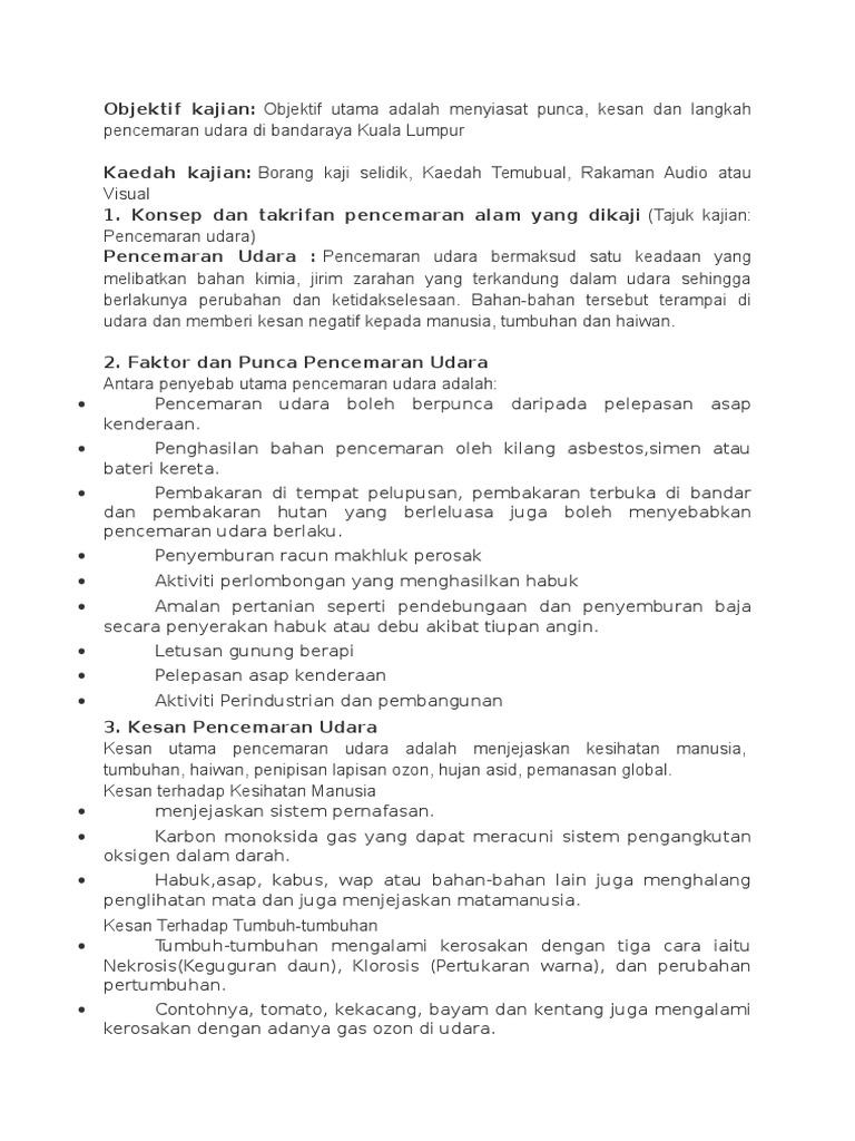 Objektif utama adalah menyiasat punca, kesan dan langkah pencemaran udara di bandaraya kuala lumpur (kes kajian mesti di tempat anda sendiri). ■ antara punca pencemaran ialah: Menceritakan tentang isu pencemaran alam sekitar di malaysia berserta punca, kesan dan juga langkah untuk atasi isu ini. Masalah alam sekitar seperti pemanasan global, pencemaran udara, pencemaran air dan kepupusan flora dan fauna semakin mendapat perhatian. Objektif utama adalah menyiasat punca, kesan dan langkah 1.